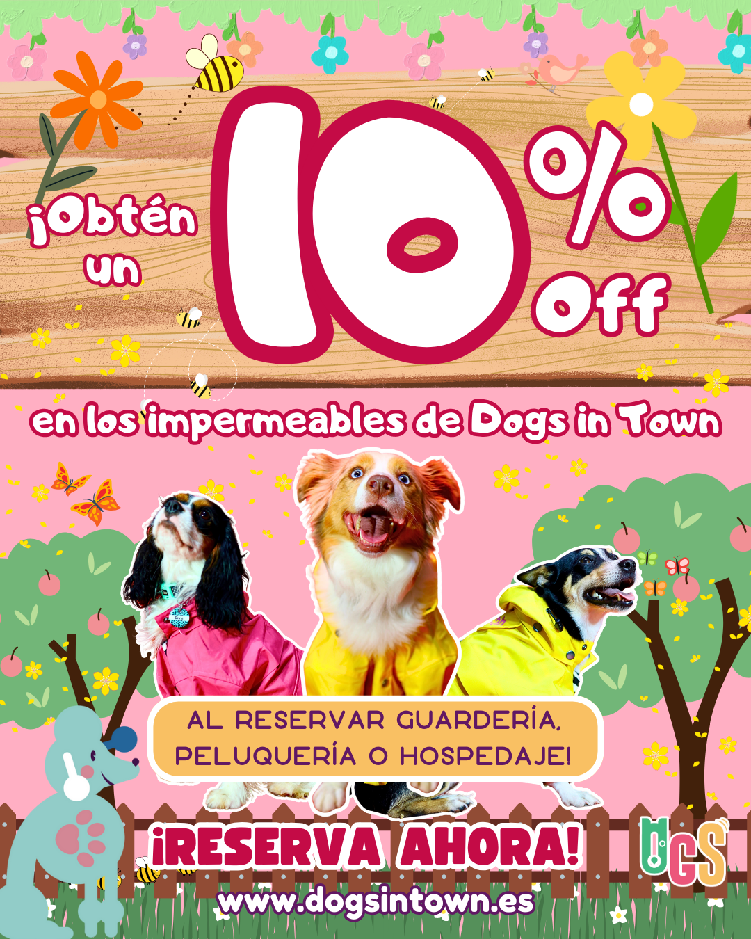 Disfruta de 10% de descuento en los impermeables de Dogs in Town al reservar guardería, peluquería o hospedaje. ¡Dale a tu perro comodidad y estilo! -