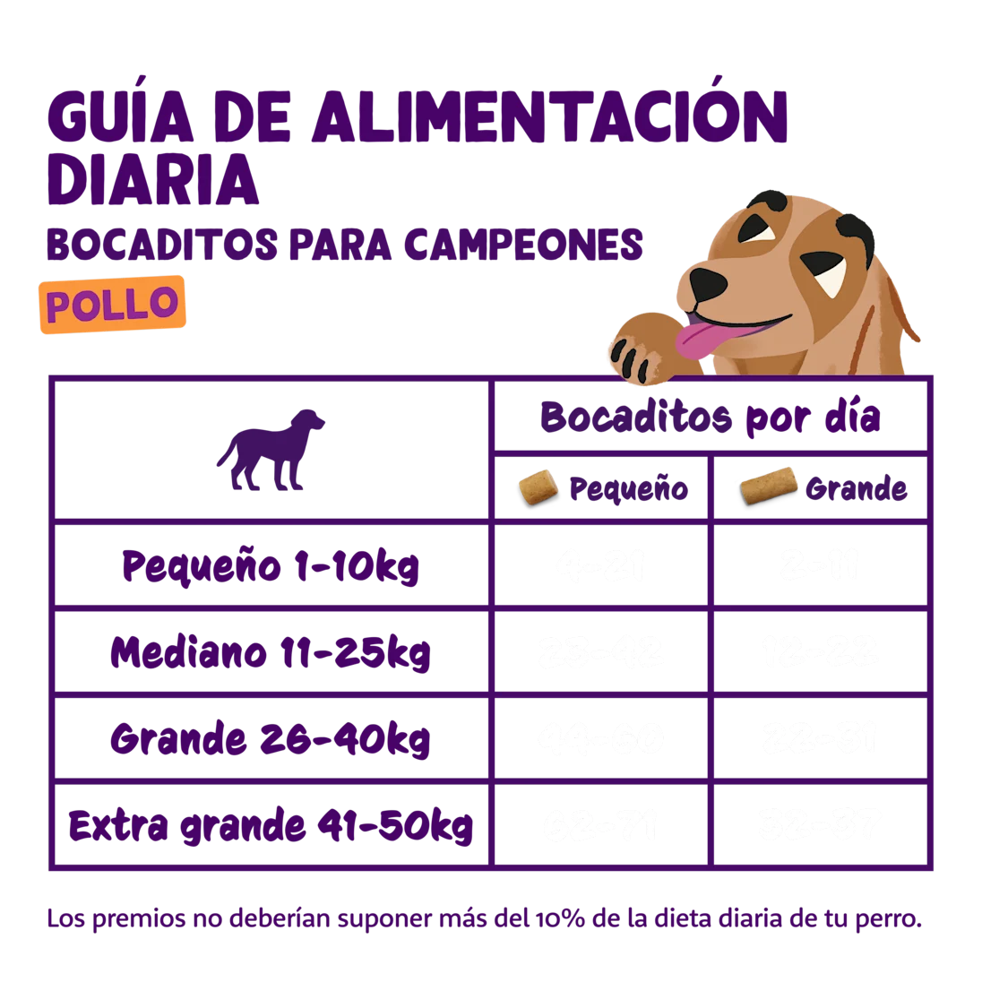Nuestros sabrosos y suaves Bocaditos para Campeones son ideales para aprender cosas nuevas juntos. Enséñale a tu amigo peludo a traer su pelota, a no morder tus zapatillas o a tumbarse. Y obtendrás a cambio un montón de meneos de cola.