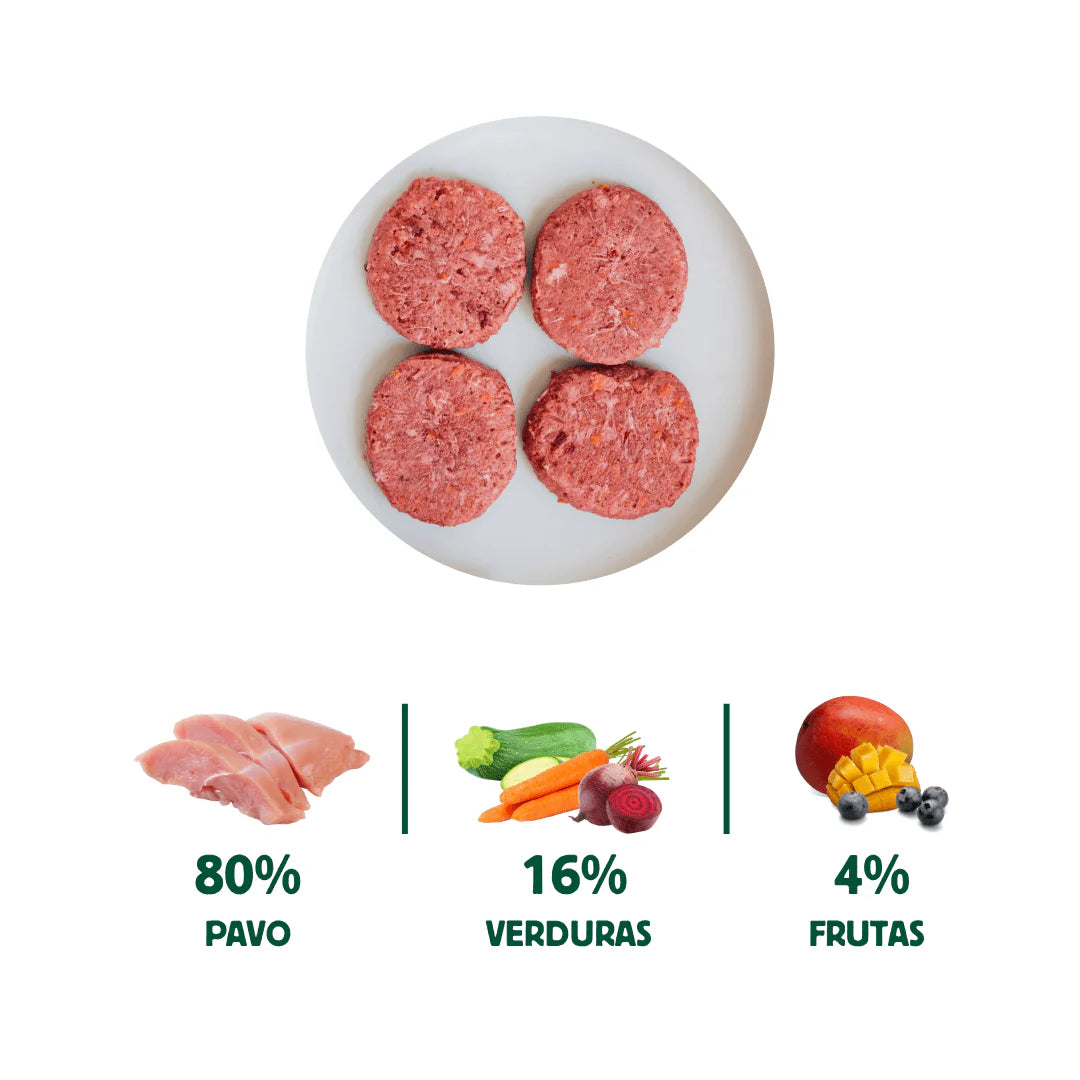 Pavo 80% (Hueso carnoso: carcasa y cuello. Carne de músculo: pechuga y corazón. Vísceras: hígado), Verduras y frutas 20% (zanahoria, calabacín, remolacha, mango 3% y arándano 1%).